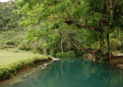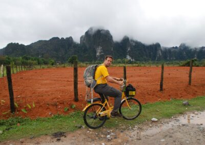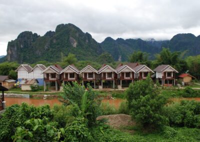 Per Minivan ging es dann weiter nach Vang Vieng. Landschaftlich mit den gigantischen Limestone-Cliffs ein Traum. Es ist aber auch das Touristenmekka für Backpacker schlechthin. Der Grund ist das Tubing. Einige reisen offensichtlich nur deswegen nach Laos, insbesondere Engländer und Australier. Per Tube (Autoreifen) lässt man sich den Fluss runtertreiben und stoppt gefühlt alle 10m an der nächsten Bar, um sich den nächsten Drink zu genehmigen. Abends ist dann eine ausgelassene Stimmung im Dorf. Wir haben auf das Tubing verzichtet (nicht nur aus Prinzip, auch weil es schlechtes Wetter war resp. Ziemlich kalt). Stattdessen haben wir Fahrräder gemietet und haben die Limestone-Klippen mit Ihren unzähligen Höhlen erkundet sowie die Blue Lagoon besucht. Alles in allem ist Vang Vieng sicher ein Besuch wert. Die Stimmung am Fluss mit den gemütlichen Restaurants und Bars ist großartig und die Landschaft sehr schön.