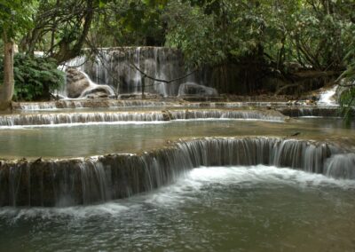 In Luang Prabang, einem Unesco World Heritage Dorf, verbrachten wir dann unsere ersten Tage in Laos. Sehr schnell fällt auf, dass die Uhr hier langsamer tickt. Gearbeitet wird nur wenn es unbedingt sein muss. Etwas zu bestellen oder eine Rechnung zu begleichen entspricht schon fast einer Herkulesaufgabe. Trotzdem, es sind sehr nette Menschen, auch wenn Sie kaum Englisch sprechen. Die Tage waren erholsam. Nebenbei haben wir einige Tempel besucht, und per Motorbike zu den Kung Si Wasserfällen gefahren – ein Paradies! Der Wasserfall besteht aus vielen kleinen Pools mit türkisblauem Wasser.