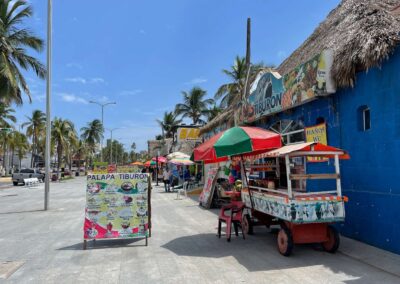 Hier treffen wir auch immer mal wieder die beiden Basler Jacky & Hansi, wessen Expeditionsmobil «Chang» zusammen mit Whaly den Atlantik überquert. Es tut gut, die Zeit mit Gleichgesinnten zu verbringen. Die Warterei zerrt an den Nerven; so können wir uns gegenseitig Mut zureden und Freud und Leid teilen. Weitere empfehlenswerte Restaurants sind La Bikina und Las Brasas. Günstig – und auch gut – essen kann man in den kleinen «Tiendas» und Restaurants. Meist ist es dort aber nicht so gemütlich zum Sitzen. Am Hauptverkehrspunkt des Strandboulevards – rund um das Aquarium – ist es eher teuer und die Musik laut. Obwohl wir die Salsa-Musik lieben; wenn man seinen Gesprächspartner kaum mehr versteht, ist der Zweck verfehlt. In dieser Ecke von Veracruz ist allgemein sehr viel los. Vor den Restaurants werden wir auf der Strasse akquiriert und Souvenir-Verkäufer möchten Ihre Sombreros verkaufen. Wir geniessen die ausgelassene Stimmung trotzdem– schnell ist klar, dass Mexikaner ein fröhliches Volk sind.